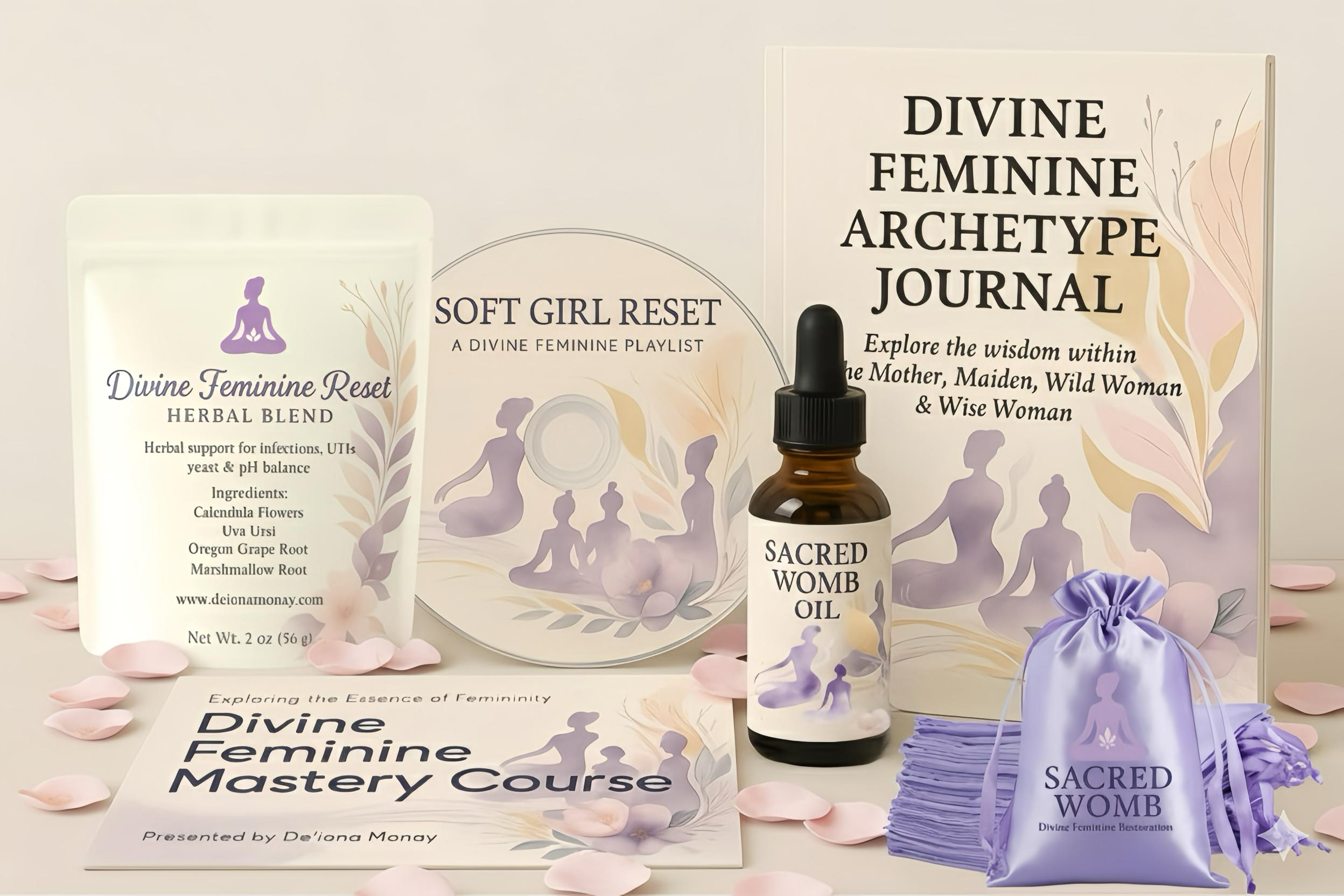 The Divine Feminine Reset is more than products—it’s a sacred experience. I created this bundle to help you step out of survival mode and back into your natural flow of softness, intuition, and embodied power. Inside, you’ll find a transformational mix of tools: my signature Divine Feminine Mastery Course, a beautifully designed Archetype Journal, a healing Affirmation Deck, a soothing herbal tea blend, the nourishing Sacred Womb Healing Oil, a practical Mini Guidebook, and my personal Soft Girl Reset Playlist.